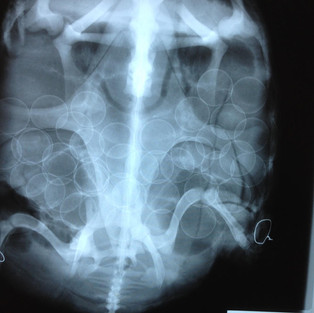 Left: Wire and tape securing a broken snapping turtle shell; Center: Radiograph showing eggs in a gravid female turtle; Right: Snapping turtle beginning to emerge from egg